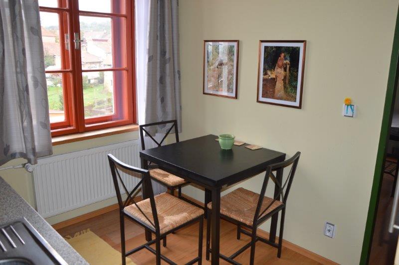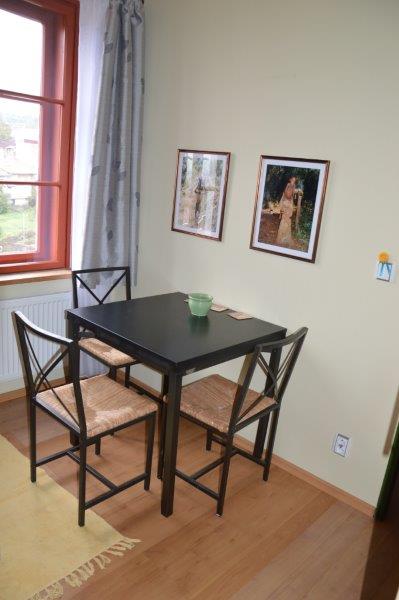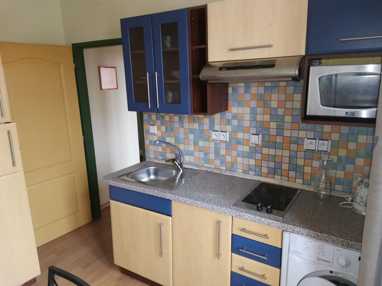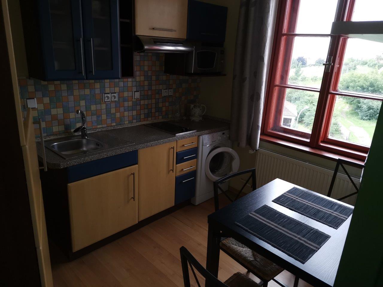 kompletně vybavený byt 1+1 cca 35m2, vybavená kuchyň ( skloker. deska, vestavěná mikrovlnka, lednička, pračka), pěkná koupelna s velkým oknem, vana, nádherný výhled do okolí, internet, sat. a TV vysílání, parkování.